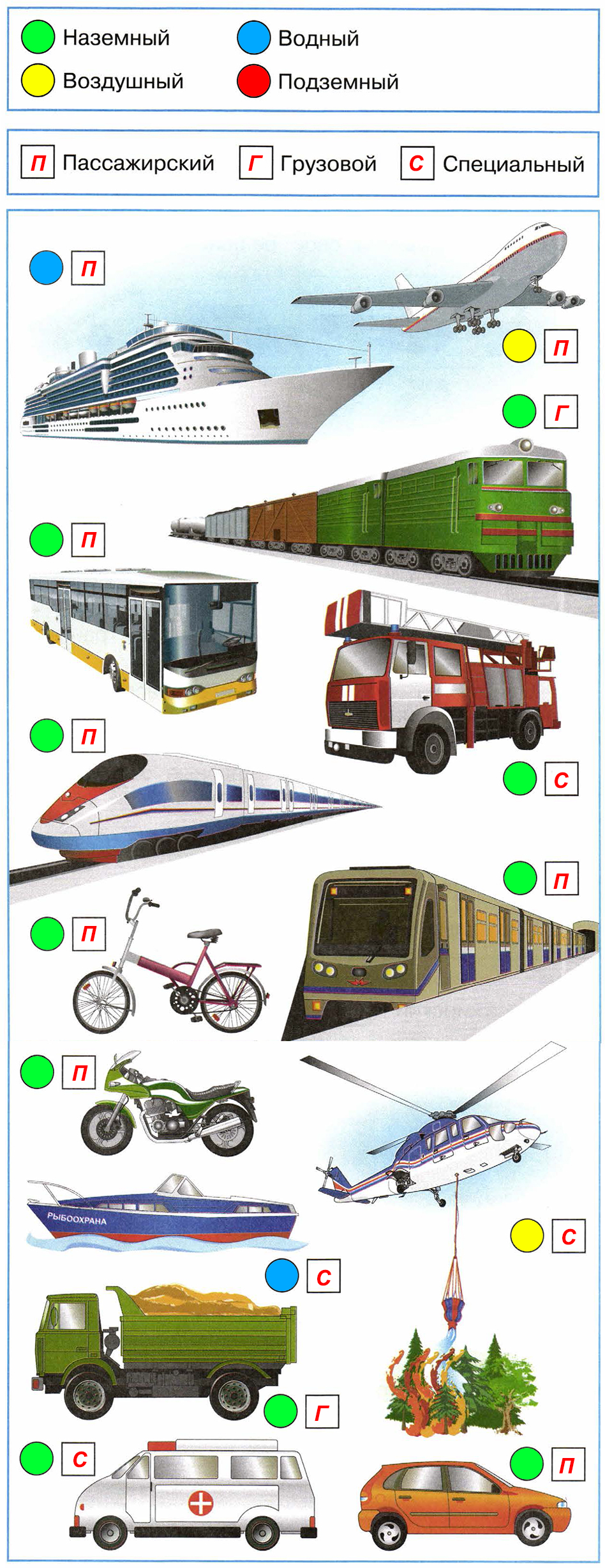 2) Отметь на тех же страницах пассажирский, грузовой, специальный транспорт первыми буквами этих слов (впиши букву в квадратик).