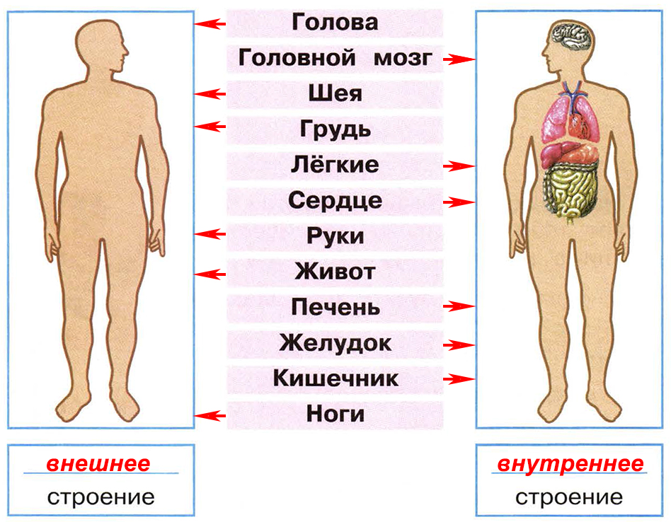• Укажи стрелками внешние части тела и внутренние органы на соответствующих рисунках.