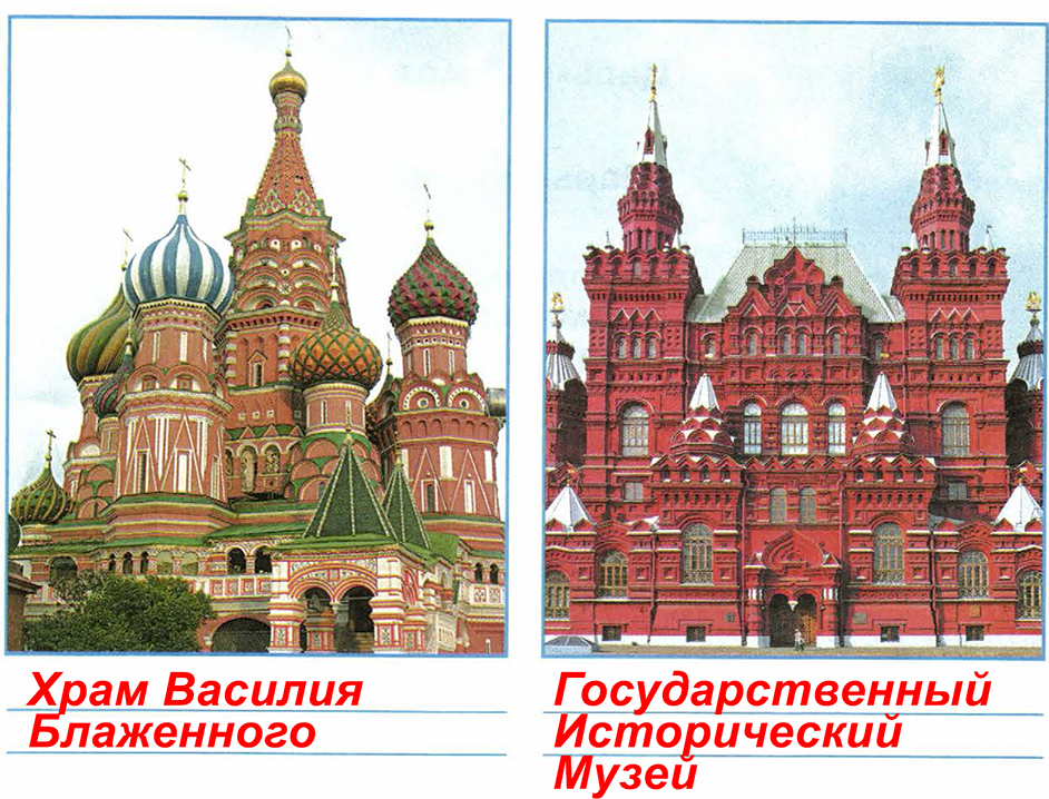 Мама Серёжи и Нади нашла в книге рассказ писателя А. Карданова об одной из достопримечательностей Москвы. • Прочитай рассказ. • На какой из фотографий изображено это каменное диво? Подпиши его название. Смотрят люди и глазам не верят. Поднимается над площадью каменное диво с узорчатыми стенами и главами. И каждая из этих глав украшена на свой манер причудливой каменной резьбой. Волнистые, ребристые, игольчатые. И разноцветные, словно радуга.